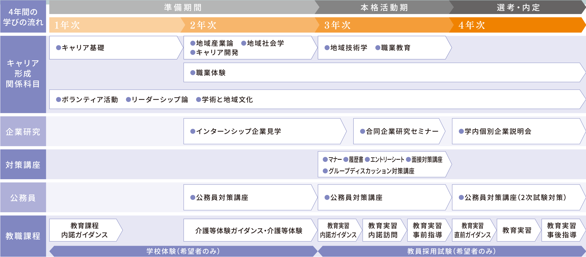 工学部ではキャリア形成科目の中に地域系の科目を組み込むことで、将来、地域産業界で活躍することをめざす学生のキャリア形成もサポートしています。