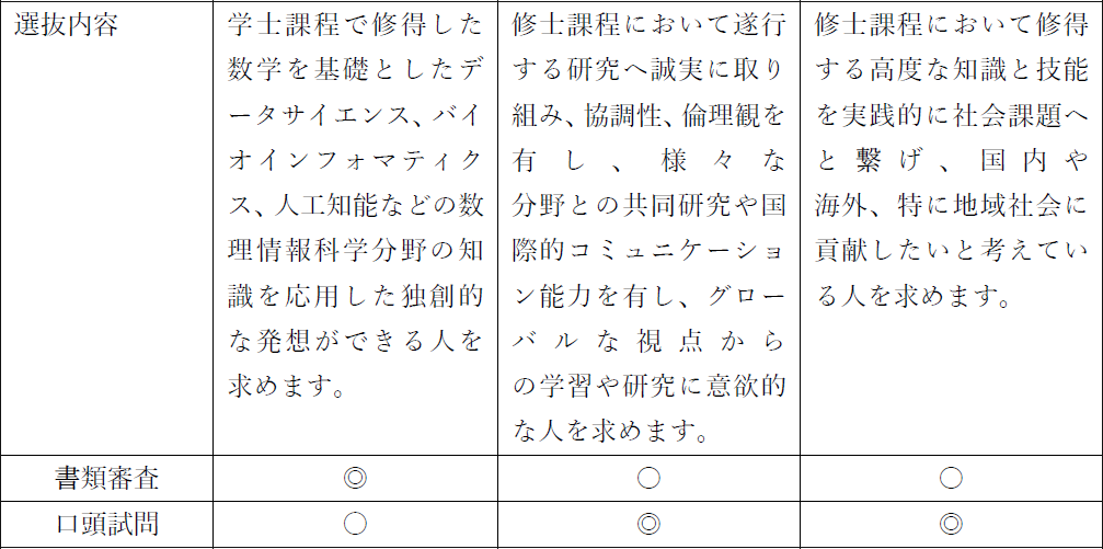 - 学士課程で修得した数学を基礎としたデータサイエンス、 バイオインフォマティクス、人工知能などの数理情報科学分野の知識を応用した独創的な発想ができる人を求めます。