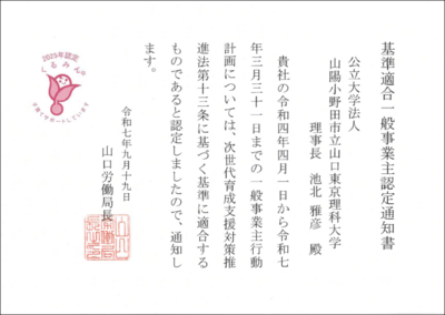 本学は、山口県で実施している、男女がともに働きながら安心して子どもを生み育てることができる雇用環境づくりに取り組む企業を奨励・支援し、その取組を広く紹介するため、一般事業主行動計画の取組を宣言(公表)する企業の届出制度(「やまぐち子育て応援企業」宣言制度)に認定されました。