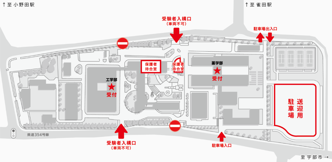 ●受験者の送迎にあたっては次の図に示す送迎用駐車場(以下「駐車場」という。)を利用し、受験者の乗降は必ず駐車場で行ってください。駐車場を除き、大学敷地内への自家用車、タクシー等の乗り入れは原則として認められません。
