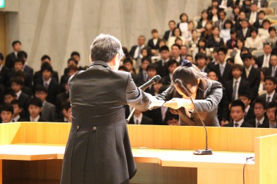 学長式辞では森田学長より「大学への入学は人生の目標のための手段であり、目標ではありません。目標と手段をくれぐれも間違えることの無いようにしてください」と新入生を激励しました。