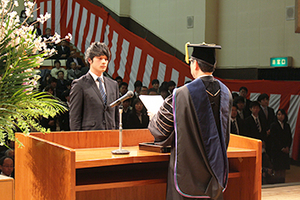 卒業・修了生を代表し、応用化学科の栗山鮎美さんは「勉学において、素晴らしい先生方の御指導のもと、物事の本質を捉え、自分の考えを形成していくことの大切さを学びました。また、学生生活を共に過ごし、心から分かち合える多くの友人たちと出会えたことは、これから新たな道へ進みだす私たちの心のよりどころになるものです。そして、充実した大学生活を送れたのは、家族の支えがあったからこそであり、その感謝の気持ちは言葉では言い表せないほどです。これからは、学生生活で培った知識や経験、仲間との絆を糧に、日々自分にできることを精一杯取組み、一歩一歩前に進んでいきます。」と、謝辞を述べました。