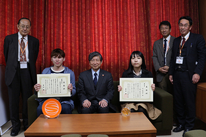 表彰式では森田学長から表彰状と副賞が授与され、学生から「まさか受賞するとは」と言いながらも笑顔がこぼれていました。