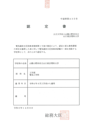 総務省から電気通信主任技術者の国家試験一部免除校に認定されるのは、山口県内の大学では本学が初めてとなります。