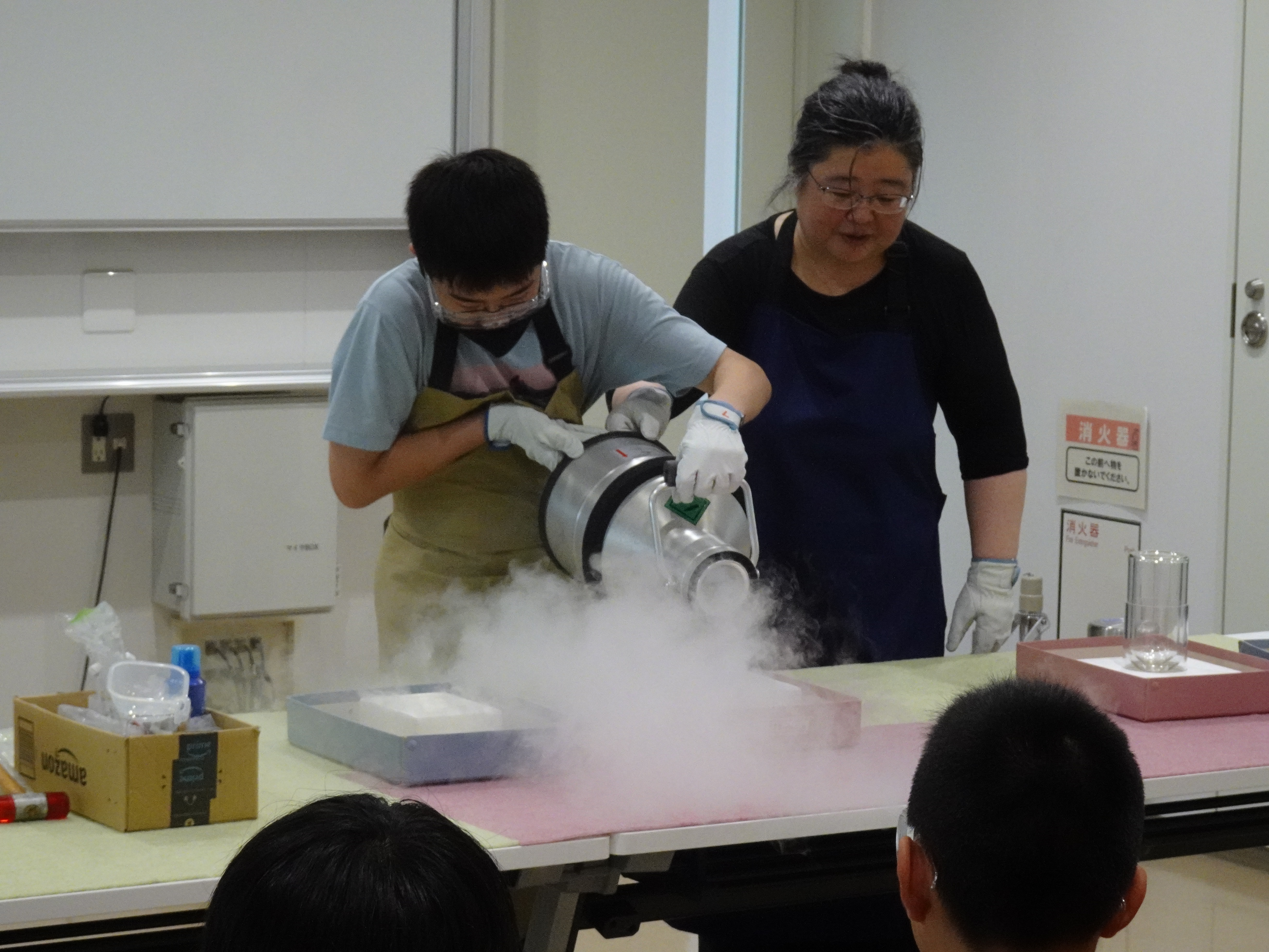 今回のテーマは、「ヒエヒエ液体窒素・ウキウキ超伝導 ~実験で体験する科学の驚き~」。担当は、共通教育センターの兼安洋乃 准教授と、学生スタッフの村岡浩基さん(大学院 応用化学専攻 修士1年)、西村明香里さん(工学部 応用化学科 4年)です。