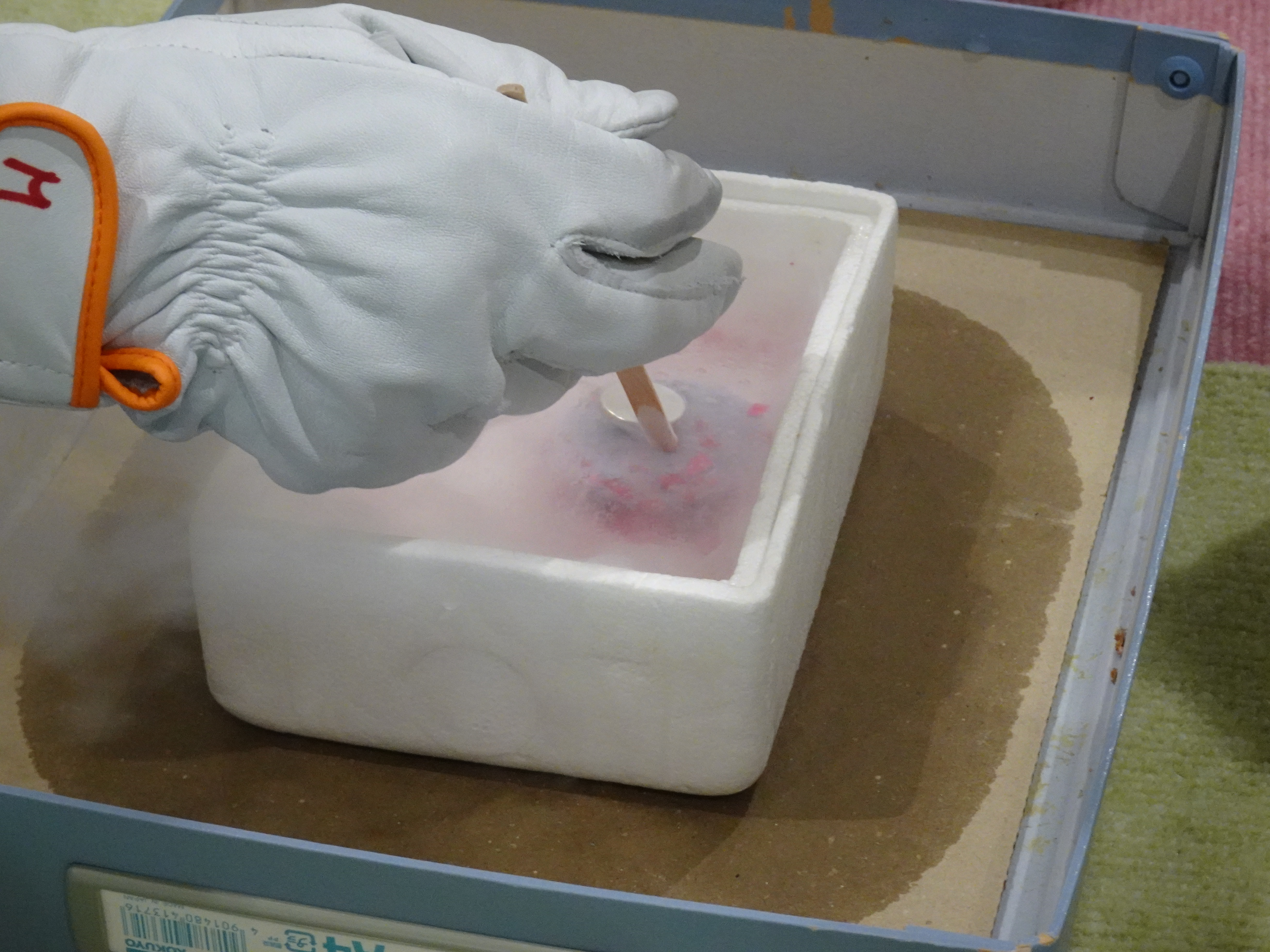 県内から選ばれた小・中学生6名とその保護者が、6号館プレナリーセッション室に集い、保護メガネ、エプロン、皮手袋を装着し、教員と学生スタッフの指導の下、低温の液体窒素を用いた2つの実験を体験しました。 【その1:物質の変化の実験】 液体窒素にゴムボールを入れるとカチカチになってパーンと破裂。お花も触れただけでパリパリに砕けてしまう様子に、みんなびっくりしていました。さらに、二酸化炭素で膨らませた風船がだんだん小さくなりドライアイスができる様子を観察。出来上がったドライアイスを取り出してヒエヒエ体験をしました。 【その2:電気・磁気的な変化の実験】 LEDの光が暖色から寒色に変化して、エネルギーがアップ。超伝導体の上で磁石が浮かぶと、思わず「おぉ~!」と歓声があがり、ウキウキ超伝導!を体験しました。