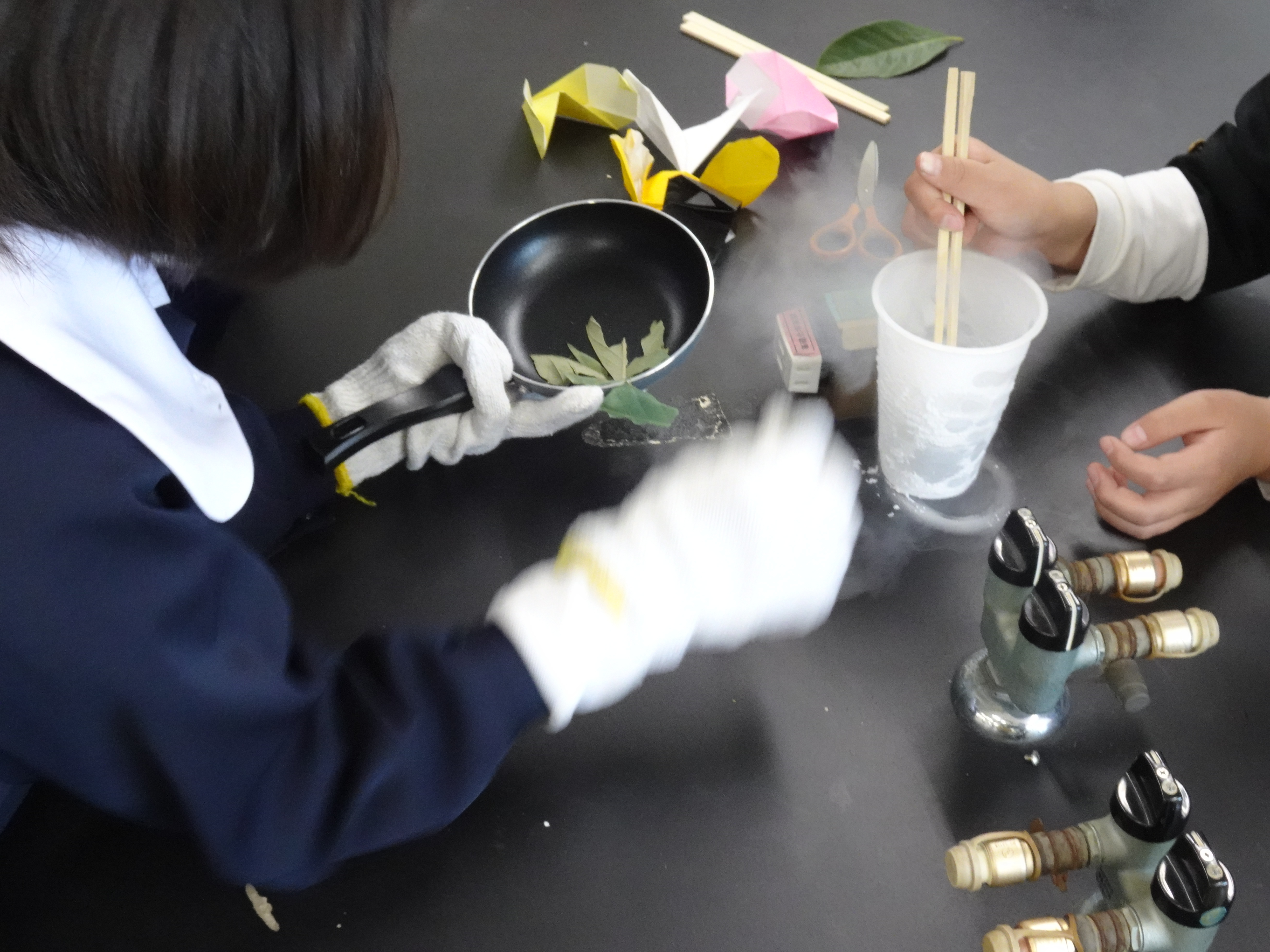 折り紙と葉っぱを液体窒素に入れ、軍手を着けた手で握り潰した。
