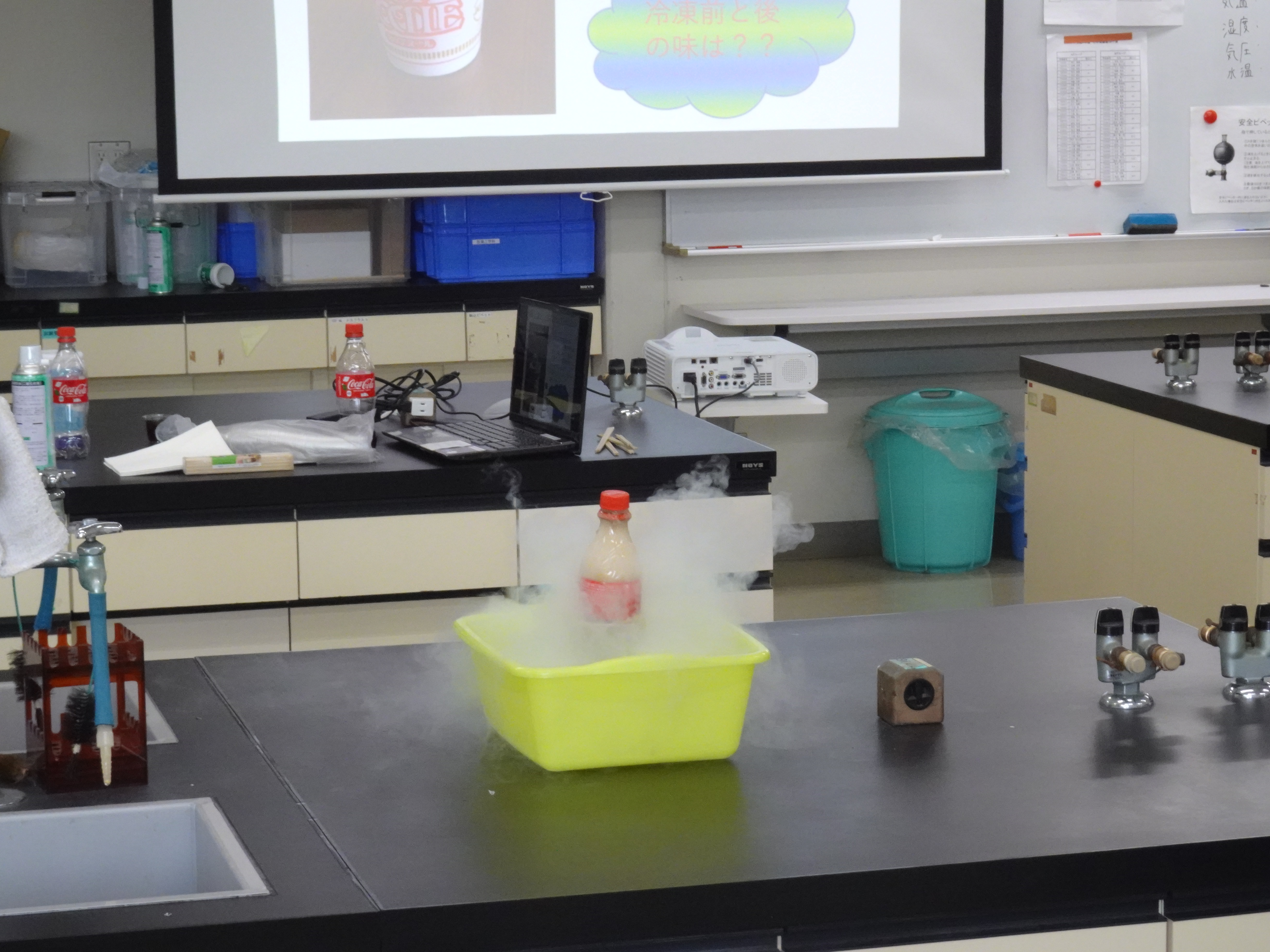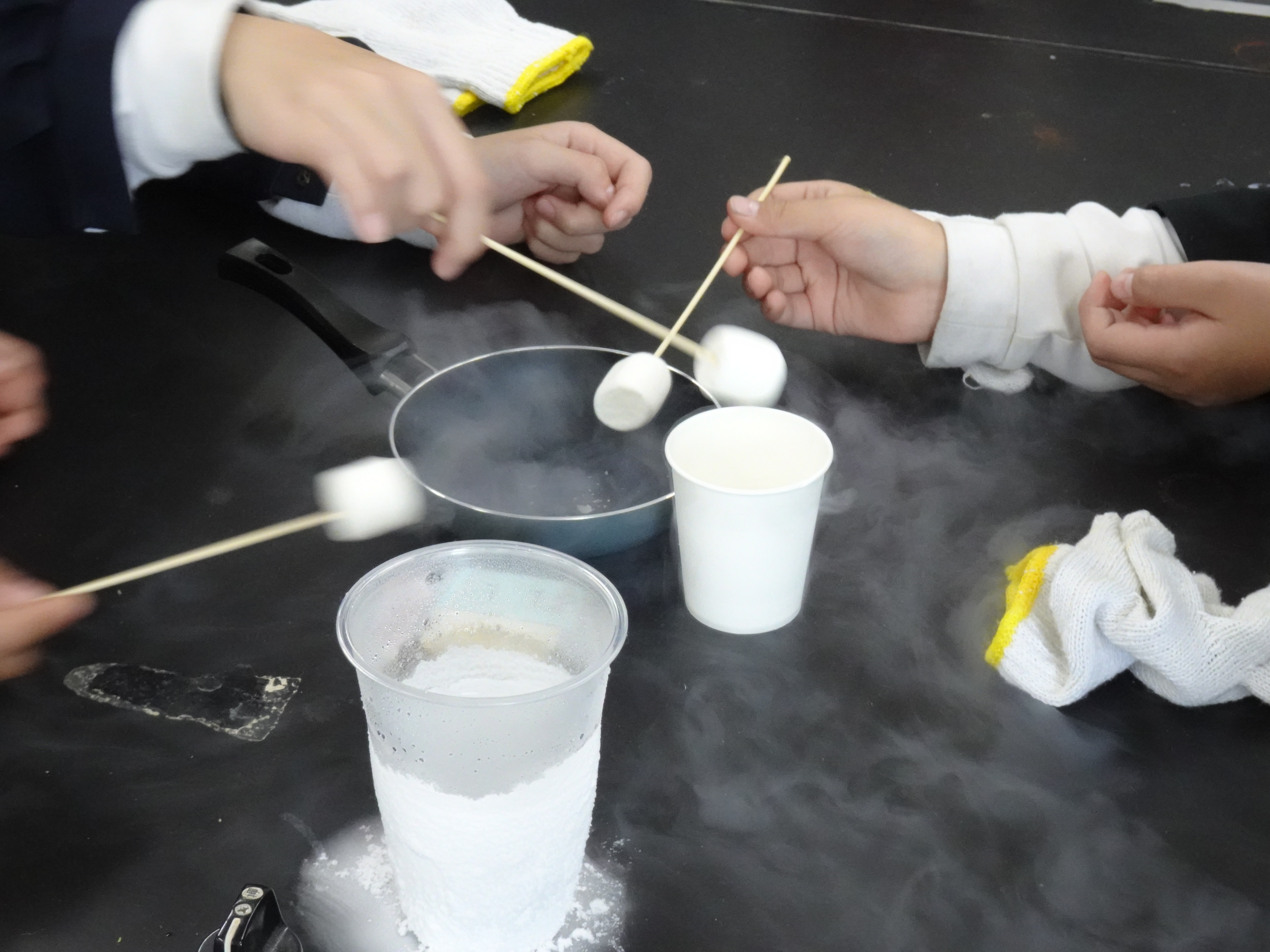膨らませた風船を液体窒素に入れると小さくなり、液体窒素から出して温まると膨らんだ。また、小さくなった風船を切ると白い粉が出現。