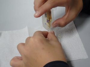 初めに牛島教授から薬の種類について説明があり、その後、ビタミンCの顆粒剤を使った3つの実験を行いました。