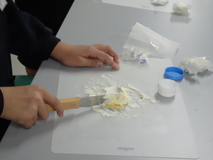 児童は、3つの実験に積極的に取組み、薬剤師体験として、混ぜたクリームを、ヘラを使って軟膏壺に詰める作業も行いました。