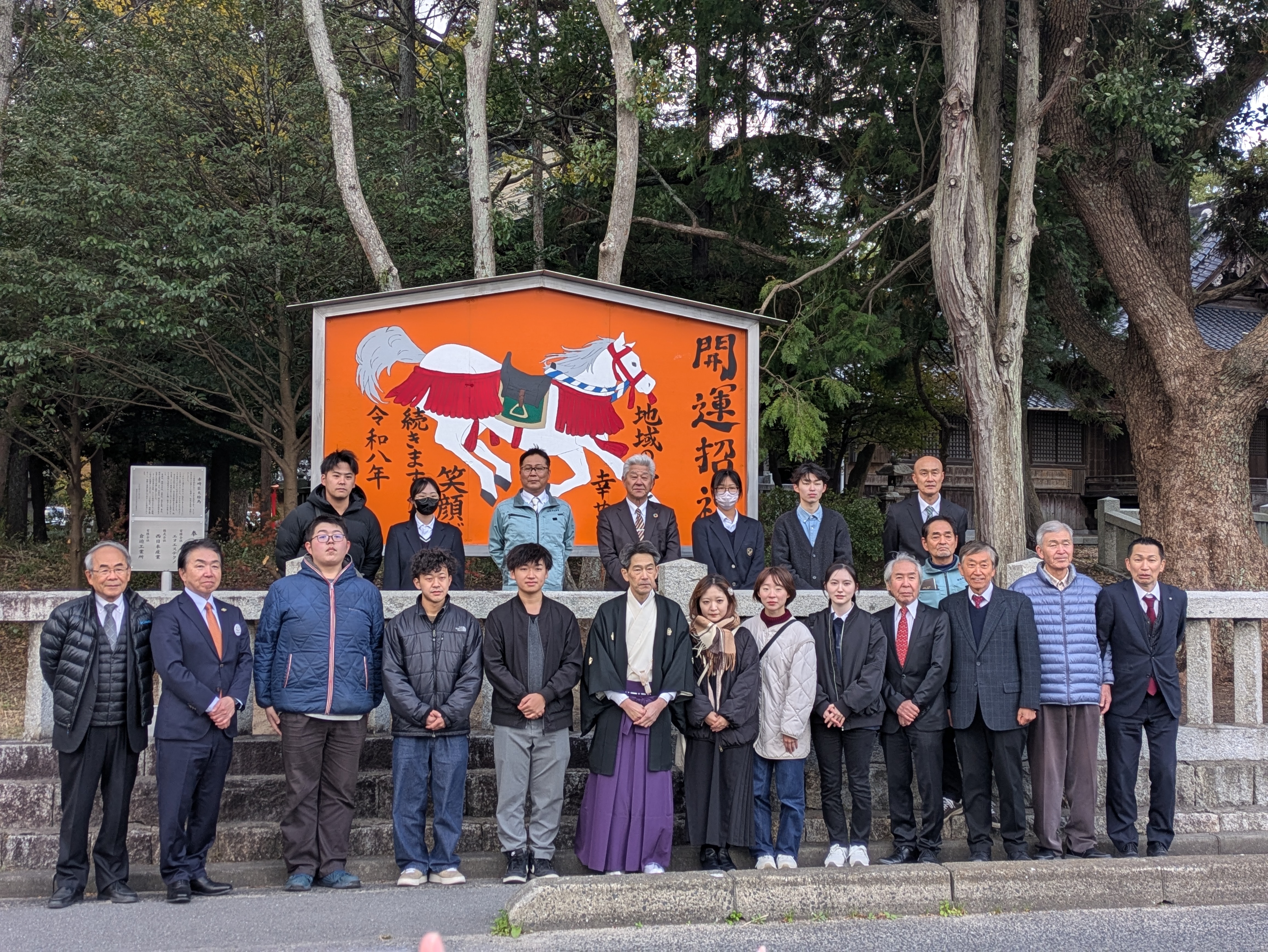 来年の干支である「うま」をモチーフにした白馬が力強く描かれた絵馬には、「地域の皆さまの幸せと笑顔が続きますように」などの言葉がしたためられており、当日は地域住民の皆さまを含む約30名が完成を見守りました。 今回制作した特大絵馬は、今後も干支に合わせて更新していく予定です。 本学はこれからも地域との連携を深め、学生の学びと地域貢献活動を推進してまいります。
