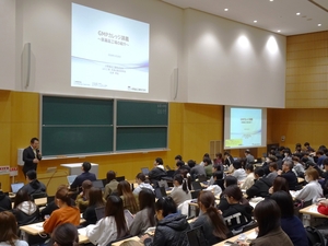 講演には約220名の学生が参加し、会社概要、医薬品工場の紹介、注射剤の製造工程、業務フロー、工場内における部門連携といった内容について、写真や動画、図表を交えて御説明いただきました。手順に従って、製造や試験を実施し品質を担保すること、そして高品質な製品の安定供給を実現するための、幅広いGMP管理について学ぶことができました。