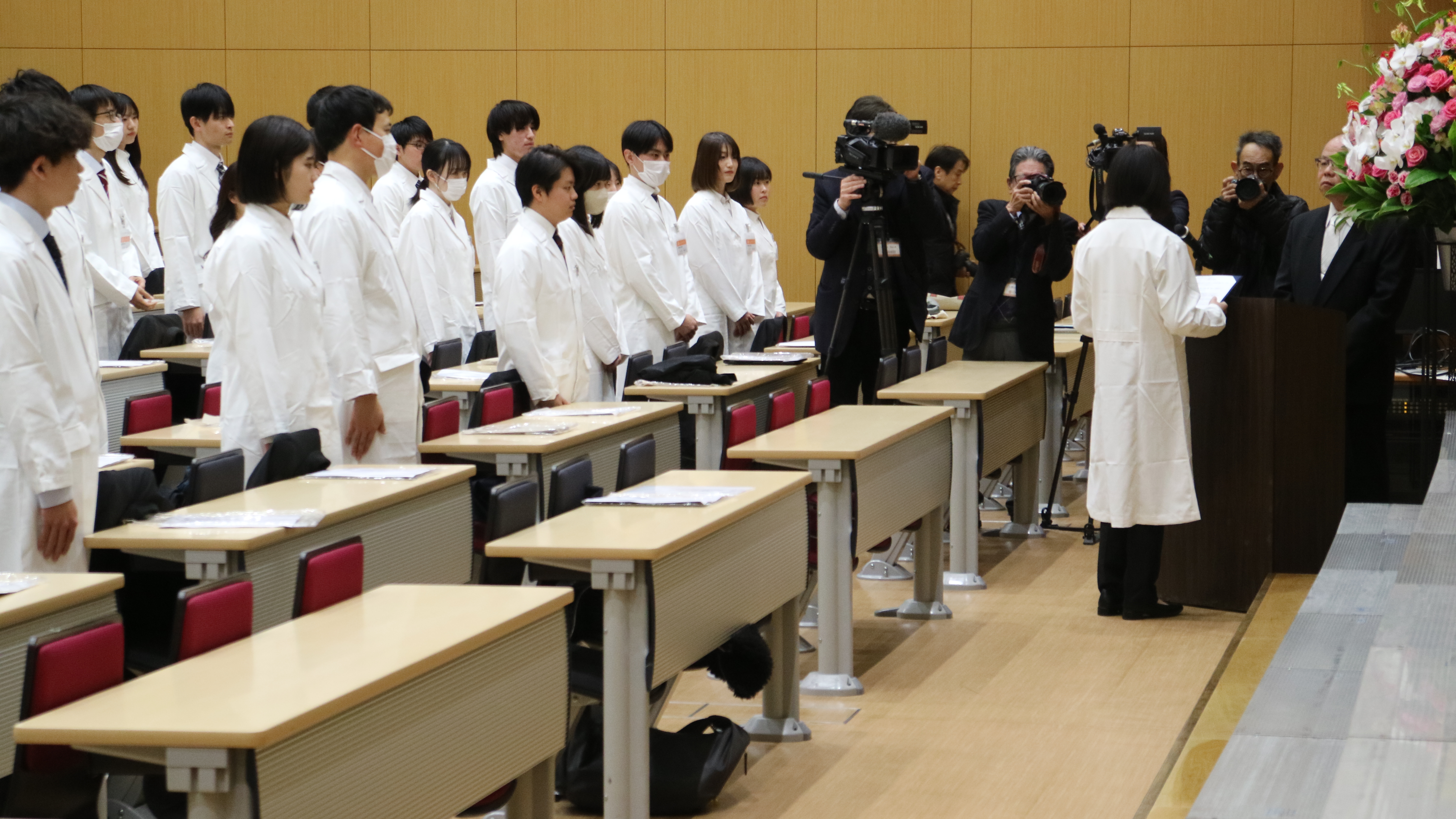 新たな白衣に身を包んだ実務実習生は、これまでに学んだ知識や技能を基盤として、実務実習を通じて実践力を高め、将来、社会に貢献できる薬剤師となることを誓いました。