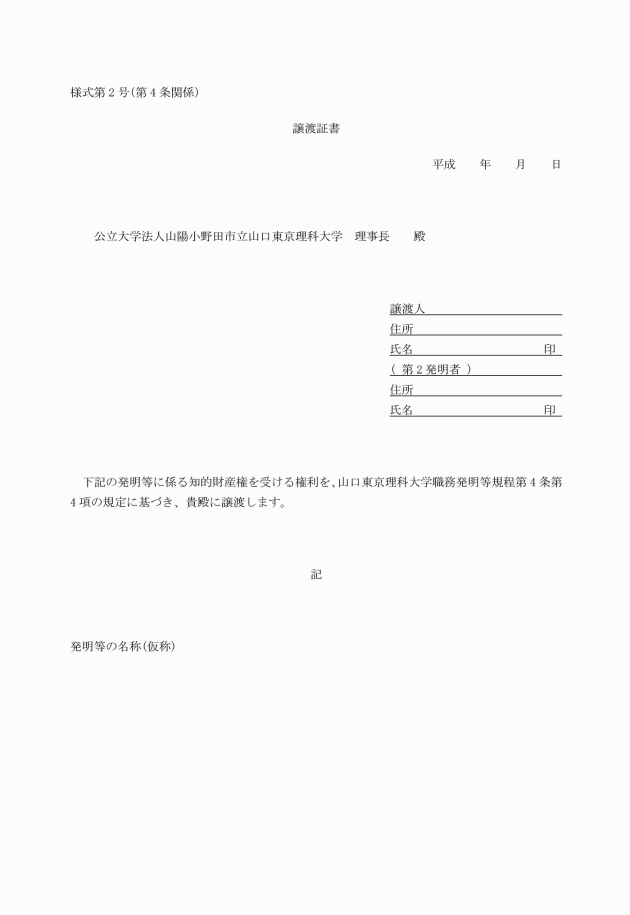 第16条 公立大学法人山陽小野田市立山口東京理科大学業務規程第5条第1項及び第2項に規定する職員以外の者が行った発明等について、発明等を行った本人から理事長に書面により特許を受ける権利の譲渡申出があった場合においては、この規程の定めを準用する。