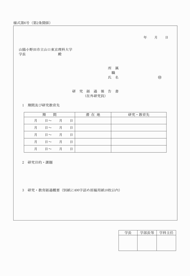第1条 山陽小野田市立山口東京理科大学在外研究員等規程(平成28年規程第100号。以下「規程」という。)第5条第1項の規定により、在外研究員を希望する者は、山陽小野田市立山口東京理科大学国際交流センター(以下「国際交流センター」という。)で定める期日までに研究計画書(様式第1号)に履歴書・研究業績(様式第2号)を添えて学科主任を経て学部長又は共通教育センター長(以下「学部長等」という。)に申し出なければならない。この場合において、助教については、このほかに学科主任又は共通教育センター長の推薦書(様式第10号)を添付しなければならない。