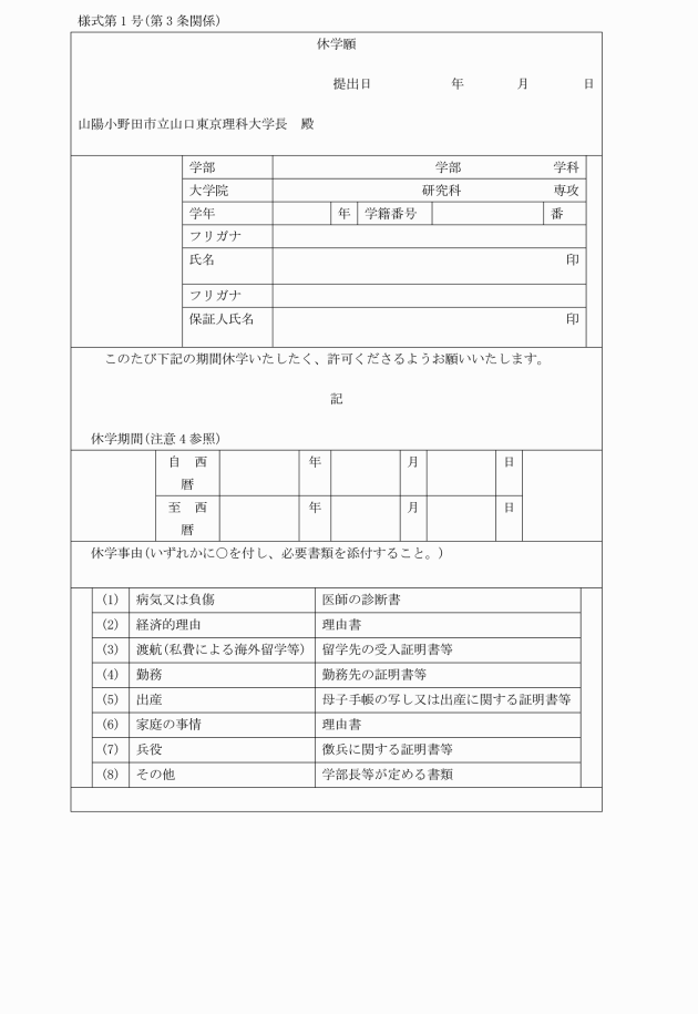 第3条 休学を願い出る者は、次に掲げる区分に応じ、当該期間までに保証人連署による休学願(様式第1号)にその具体的な事由を記載の上、学生証の写しを添えて学部長又は研究科長(以下「学部長等」という。)に提出し、学長の許可を得なければならない。