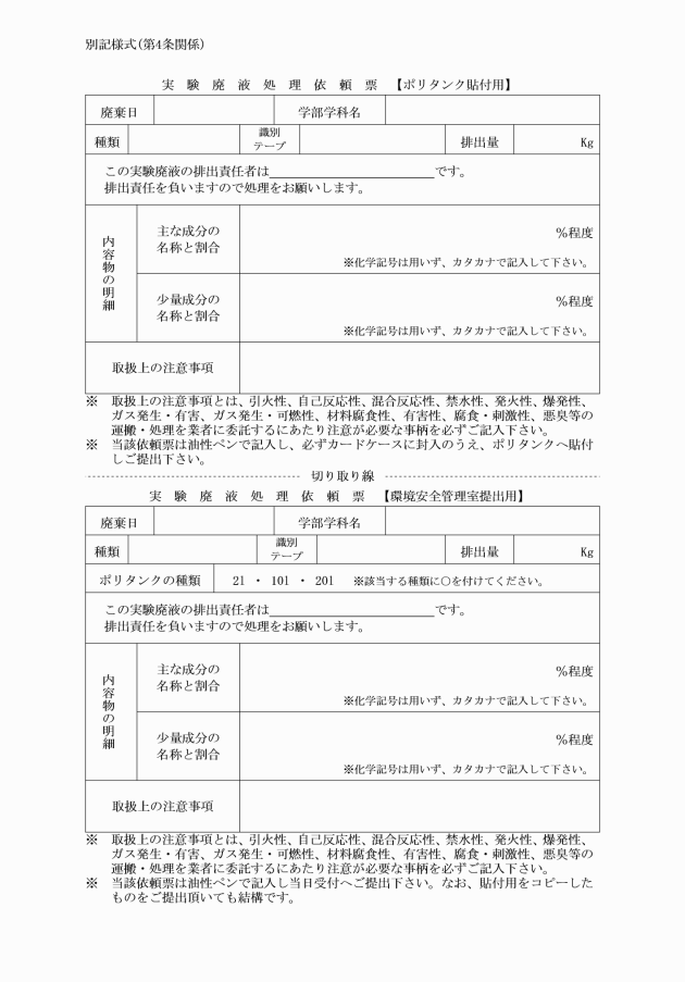 第4条 廃液を入れた容器には、別記様式「実験廃液処理依頼票」に内容物を記入のうえ、貼付する。
